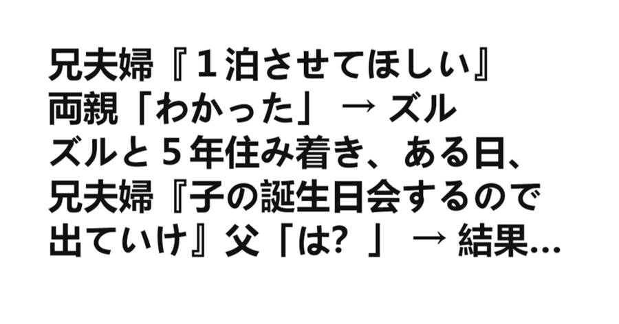 兄夫婦『1泊させてほしい』両親「わかった」 → ズルズルと5年住み着き、ある日、兄夫婦『子の誕生日会するので出ていけ』父「は?」 → 結果…
