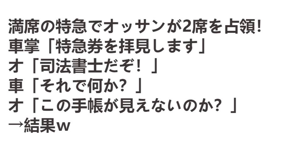 満席の特急でオッサンが2席を占領。車掌「特急券を拝見します」オ「司法書士だぞ!」車「それで何か?」オ「この手帳が見えないのか?」→結果w