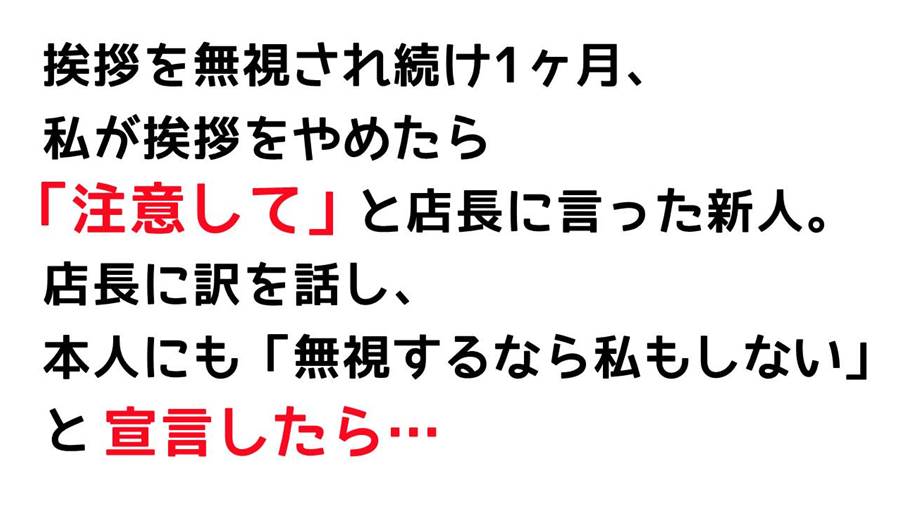 【変な人】挨拶を無視され続け1ヶ月、私が挨拶をやめたら「注意して」と店長に言った新人。店長に訳を話し、本人にも「無視するなら私もしない」と宣言したら…