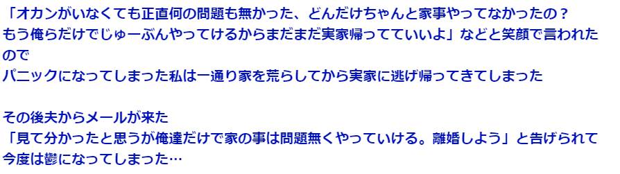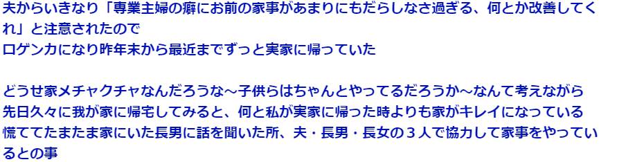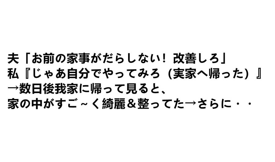 夫「お前の家事がだらしない!改善しろ」私『じゃあ自分でやってみろ(実家へ帰った)』→数日後我家に帰って見ると、家の中がすご~く綺麗&整ってた→さらに・・