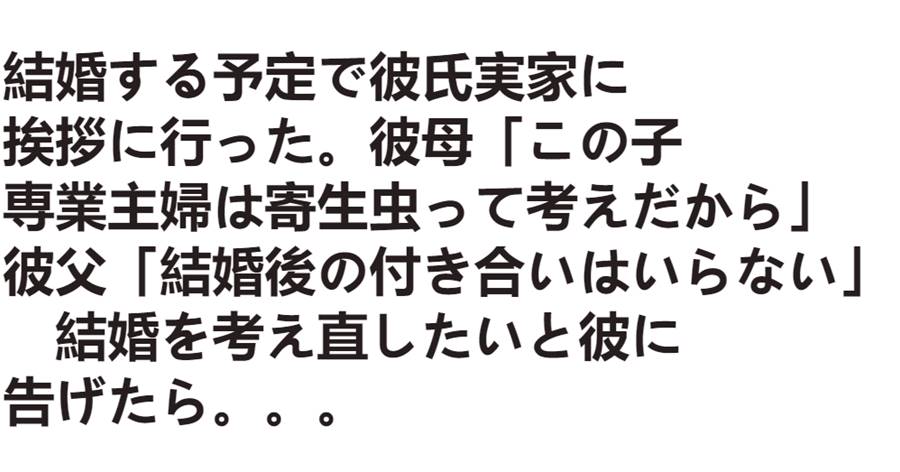 結婚する予定で彼氏実家に挨拶に行った。彼母「この子専業主婦は寄生虫って考えだから」彼父「結婚後の付き合いはいらない」 結婚を考え直したいと彼に告げたら。。。