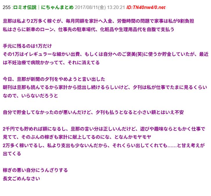旦那は私より2万多く稼ぐが、毎月同額を家計へ入金 私は色々支出が引かれ手元に残るのは1万 → ある日旦那が私が仕事でたまに見てるくらいだし夕刊要らないだろうと言い出し…