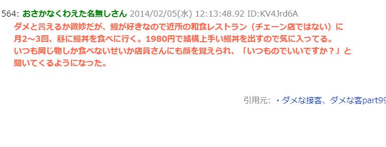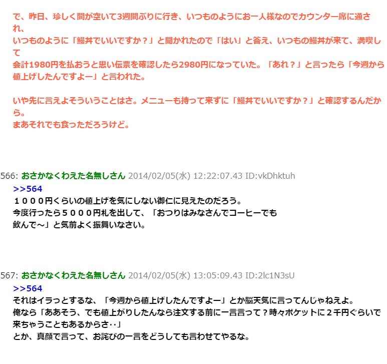 月に2〜3回和食屋で1980円の鰻丼を食べてた。店員「いつもの鰻丼でいいですか?」俺「はい」→会計時。俺「はい、1980円」伝票は2980円だった。俺「あれ?」→すると…