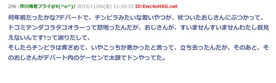 チンピラ「テメー!!なにぶつかってんだごらぁ!!」爺さん「すみません…私、目が見えないんです…」チン「あっ…こちらこそすんません…悪かったです…」→結果...