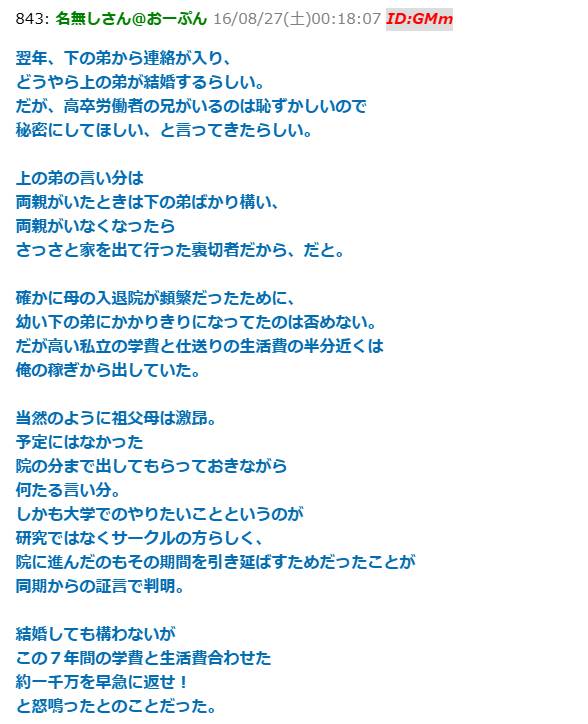 院卒の弟が結婚することに。弟「高卒労働者の兄の存在は恥だから秘密にしてくれ」祖父母「7年間の学費と生活費合わせて1千万返せ!」弟「!?」→結果…