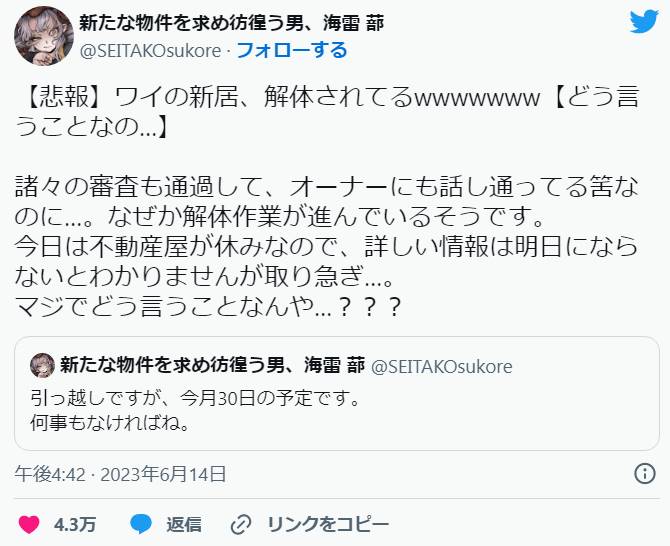 【地獄】今月末に引っ越す予定の人、なぜか解体されてる新居を見てショック → 業者に問い合わせた結果、最悪の真相が明らかになり、むせび泣く…