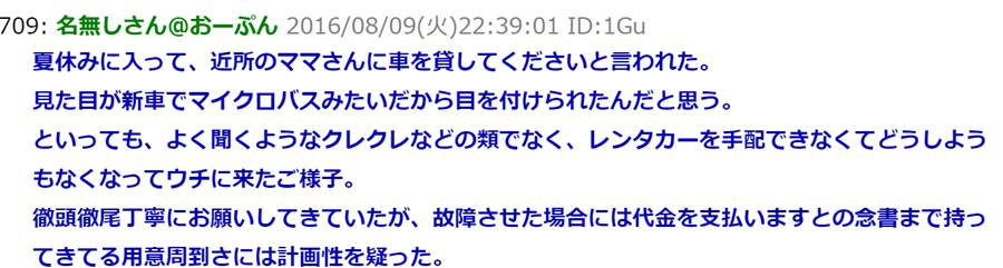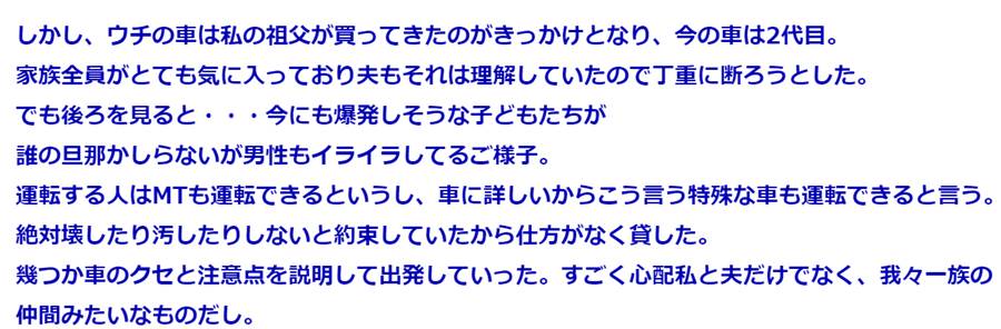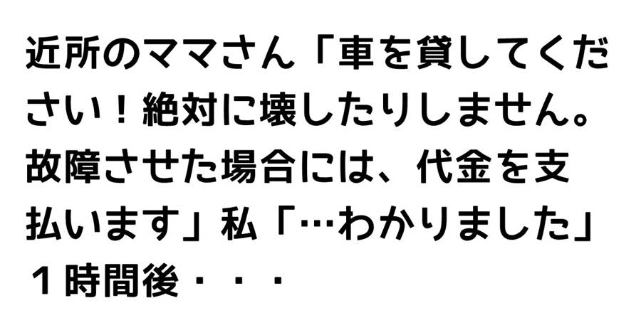 近所のママさん「車を貸してください!絶対に壊したりしません。故障させた場合には、代金を支払います」私「…わかりました」1時間後・・・