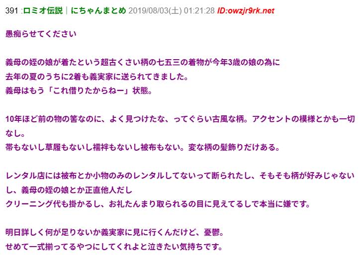 義母の姪の娘が着たとかという超古くさい柄の着物を、うちの娘の七五三のために「もう借りたからねー」というトメ。お礼とクリーニング代だけでも新品買えるわ!断ってくる!→結果