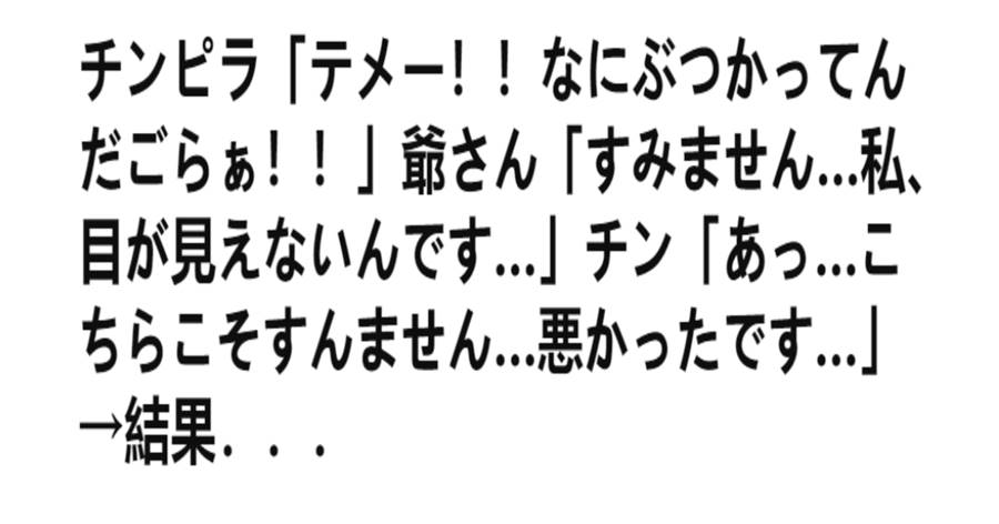 チンピラ「テメー!!なにぶつかってんだごらぁ!!」爺さん「すみません…私、目が見えないんです…」チン「あっ…こちらこそすんません…悪かったです…」→結果...