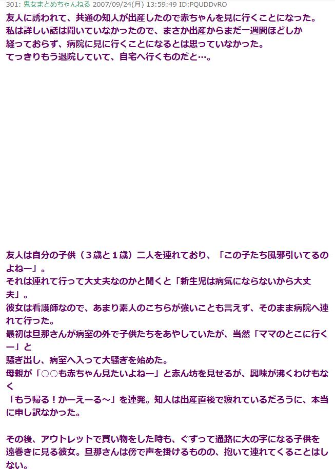 友人に誘われて共通の知人の赤ちゃんを見に行く事に... てっきり退院してて自宅へ行くものだと思ってたら出産から1週間しか経ってなくて、しかも友人は自分の子供2人を連れており…