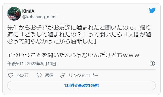 4歳の息子が友達に噛まれたと先生から報告を受けた母親。何があったのか尋ねると・・返ってきた言葉に思わず笑いが止まらない(笑)
