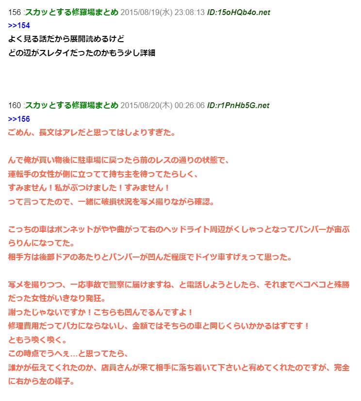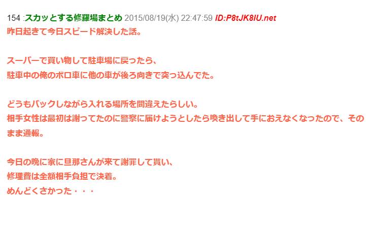 駐車場に戻ったら駐車中の俺の車に他の車が後ろ向きで突っ込んでいた。女「すみません‥すみません‥(ペコペコ)」俺「一応事故で警察に届けますね」そう告げると態度が一変し