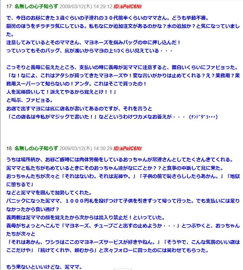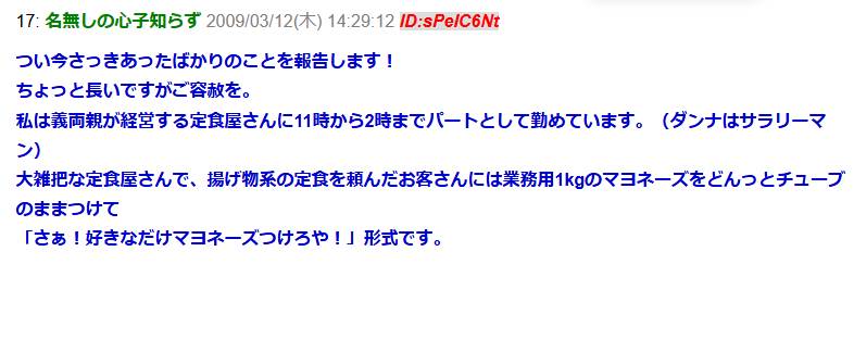 義両親が経営する定食屋さんで・・・義母「お客さん、バッグに入ってるマヨネーズうちのだよね?」泥ママ「な、なによ!これは私が買ってきた業務用マヨネーズなの!」→そしてwww