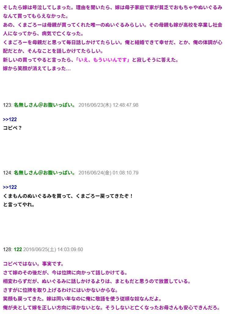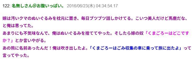 嫁は汚いクマのぬいぐるみを枕元に置き、毎日ブツブツ話しかけてる。嫁「くまごろーはどこですか?」俺「ブフッwwwゴミ収集車に乗って旅に出たよ」→信じられない結末に