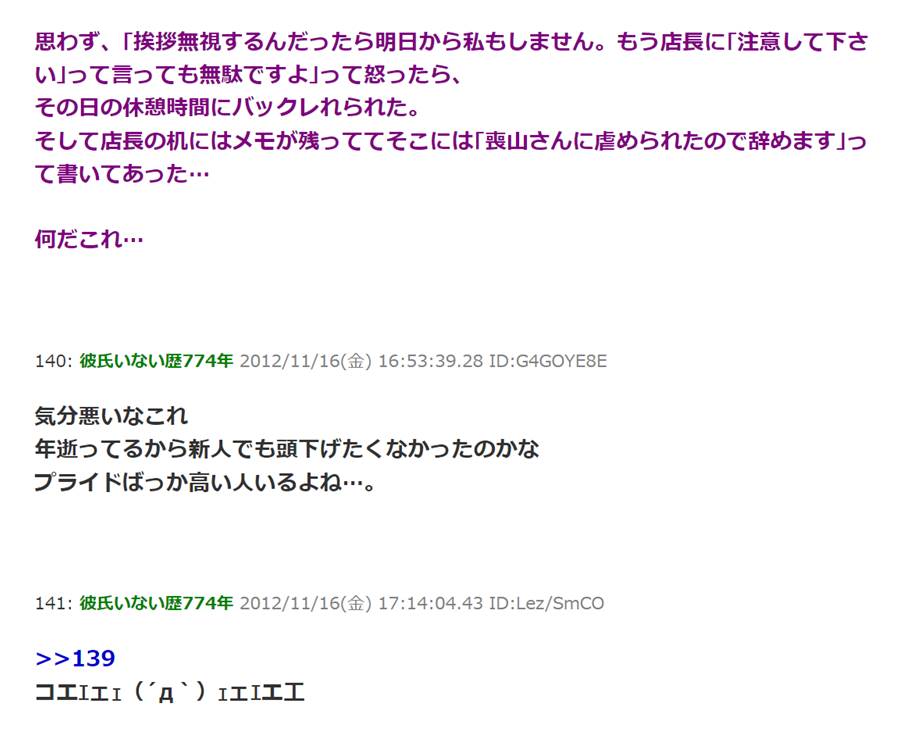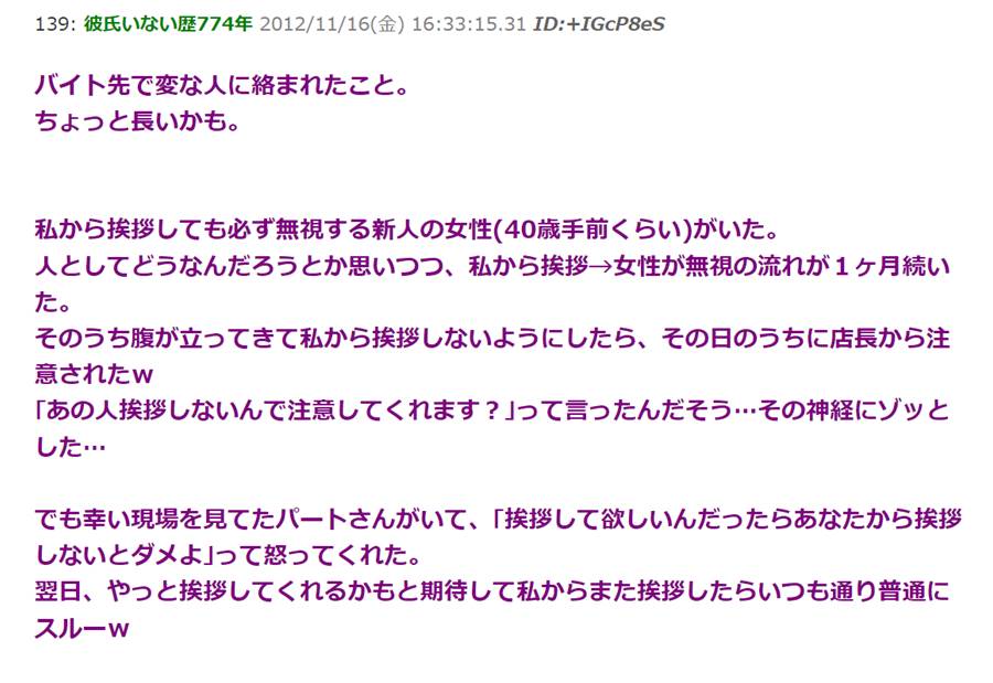 【変な人】挨拶を無視され続け1ヶ月、私が挨拶をやめたら「注意して」と店長に言った新人。店長に訳を話し、本人にも「無視するなら私もしない」と宣言したら…