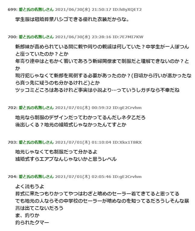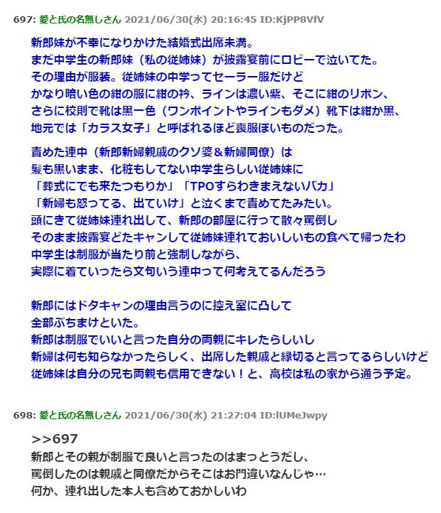 結婚式で。新郎妹(中学生)がセーラー服で参加すると、親戚、新婦同僚『葬式にでも来たつもりか!TPOすらわきまえないバカ!』新郎妹(泣) → 頭にきたので…