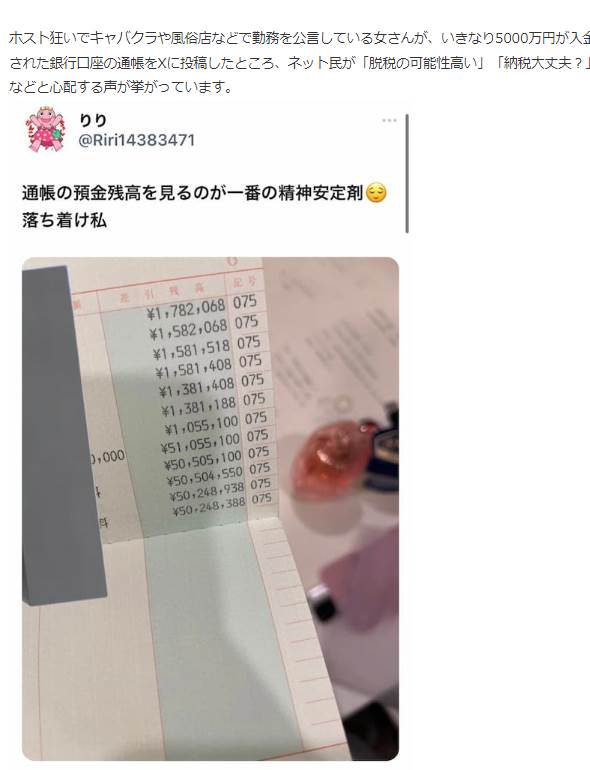 ホスト狂いの女さん、いきなり5000万円が入金された通帳をXに投稿→ネット民「納税大丈夫?」