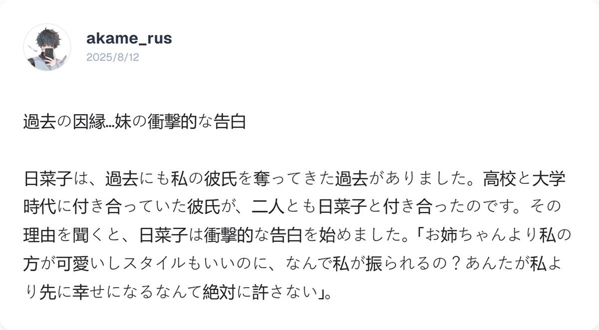 妹が過去に自分の彼氏を奪った理由を告白。姉への嫉妬心からだった