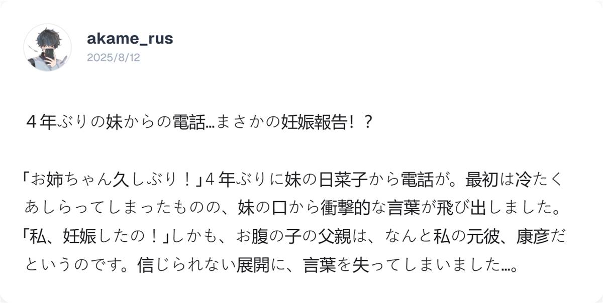 妹から久しぶりの電話。妊娠報告を受け、相手が元彼だと知って驚く