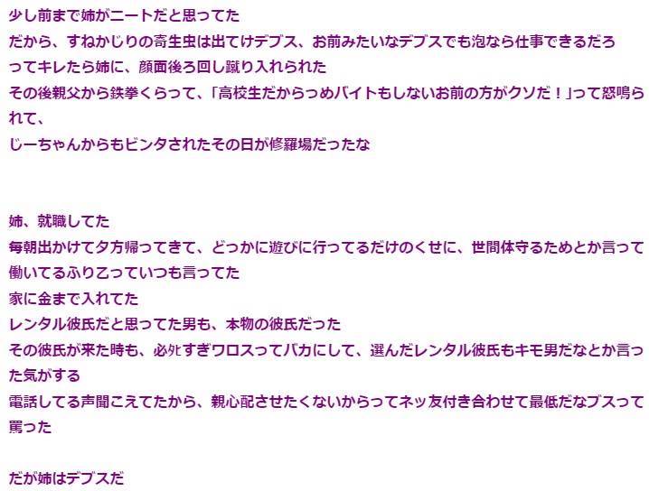 姉をニートだと思っていた。→私「すねかじりの寄生虫は出てけデブス!泡で働け」すると姉からキレられ、さらには父親からも鉄拳をくらい