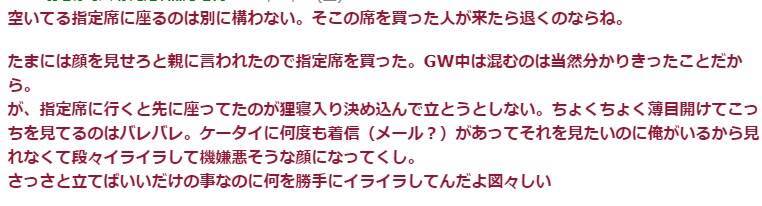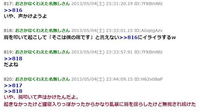 新幹線で。俺「スイマセン。ここ僕の指定席です」男(狸寝入り)俺「あの(肩ユサユサッ)」男(男のケータイが何度も鳴る)→ 狸寝入り決め込んだ男が段々イライラして…
