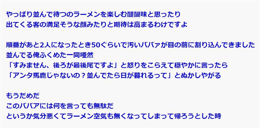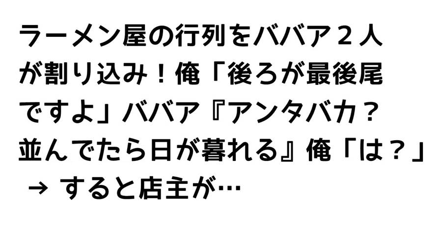 ラーメン屋の行列をババア2人が割り込み!俺「後ろが最後尾ですよ」ババア『アンタバカ?並んでたら日が暮れる』俺「は?」 → すると店主が…